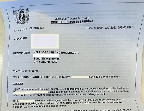 The letter arrived in the post a week later, with the clear decision: “NZLandscape and Building Ltd to pay $24,533.80“. The judge had determined I should be reimbursed in full. I thought that would be the end of it, but Dave had one last trick up his sleeve.
