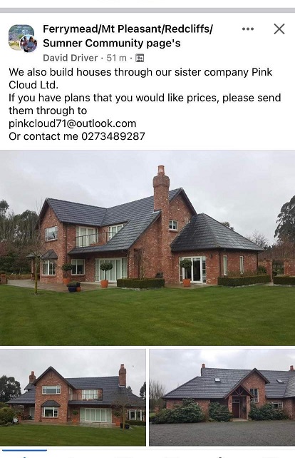 The remaining debt sits with a company Dave hasn’t filed a return for so it’s being struck off. He has started another company called Pink Cloud Limited and is posting photos on various Facebook groups around Christchurch. When I saw this post from Dave prospecting to build a house it sent shivers down my spine. That just feels illegal. I’m angry and frustrated but don’t want anyone to go through this same experience so have setup this website.