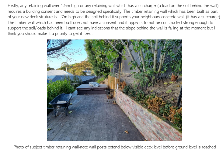 To fix the retaining wall Dave created, is going to be an extra $10K+GST, on top of the $24K cost to demolish and replace the deck (as per the Disputes Tribunal court order). That’s $34K in total to fix Dave’s work.
