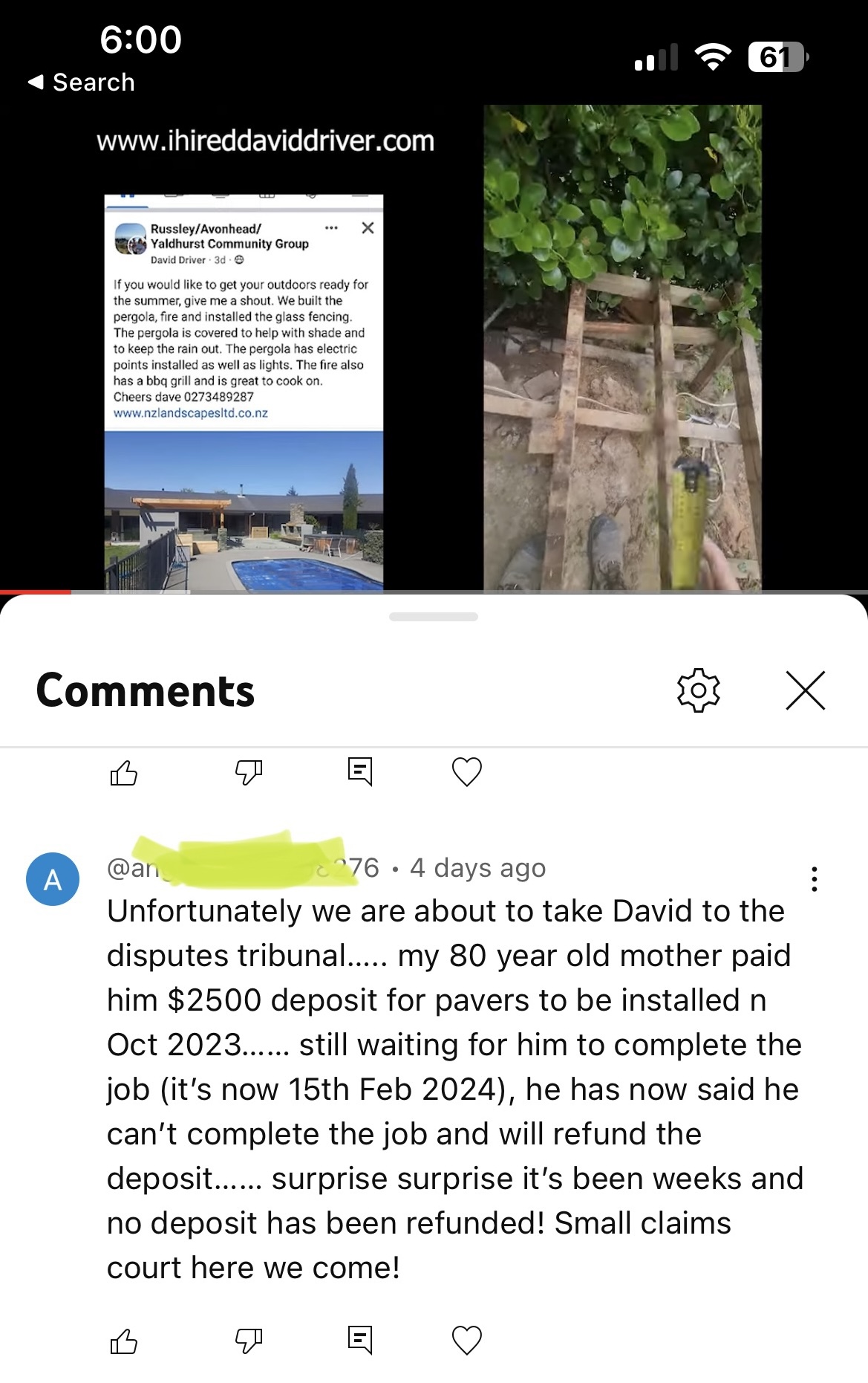 By this time, more people were discovering dodgy work done by Dave, and so he and his wife Mandy Driver vacated their rental in the middle of the night, but not without leaving rubbish and a bunch of unpaid bills which turned into another successful tenancy Tribunal claim against the pair (link to the order). It was quite some mess that Dave had built for himself, and people were finally finding out.